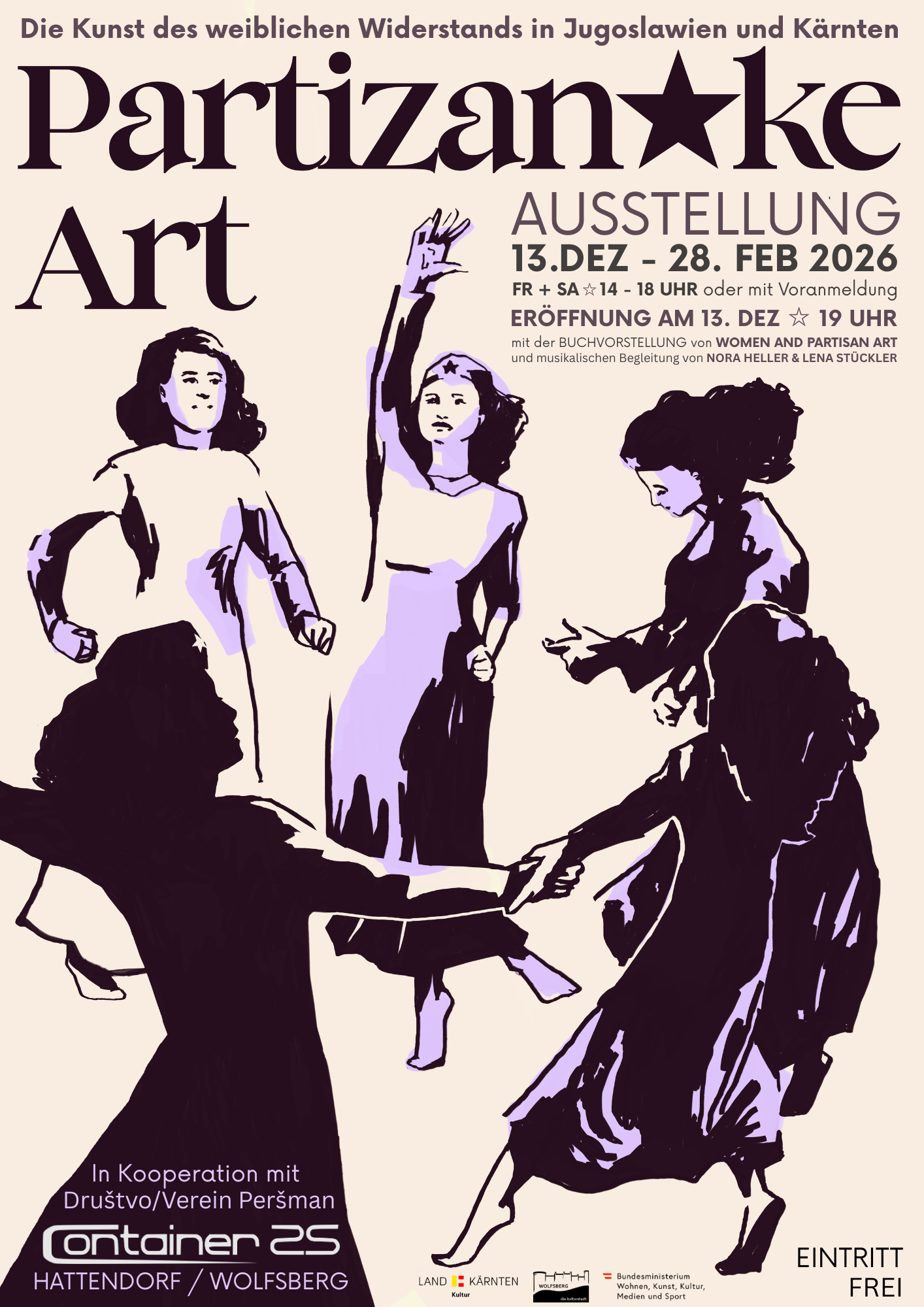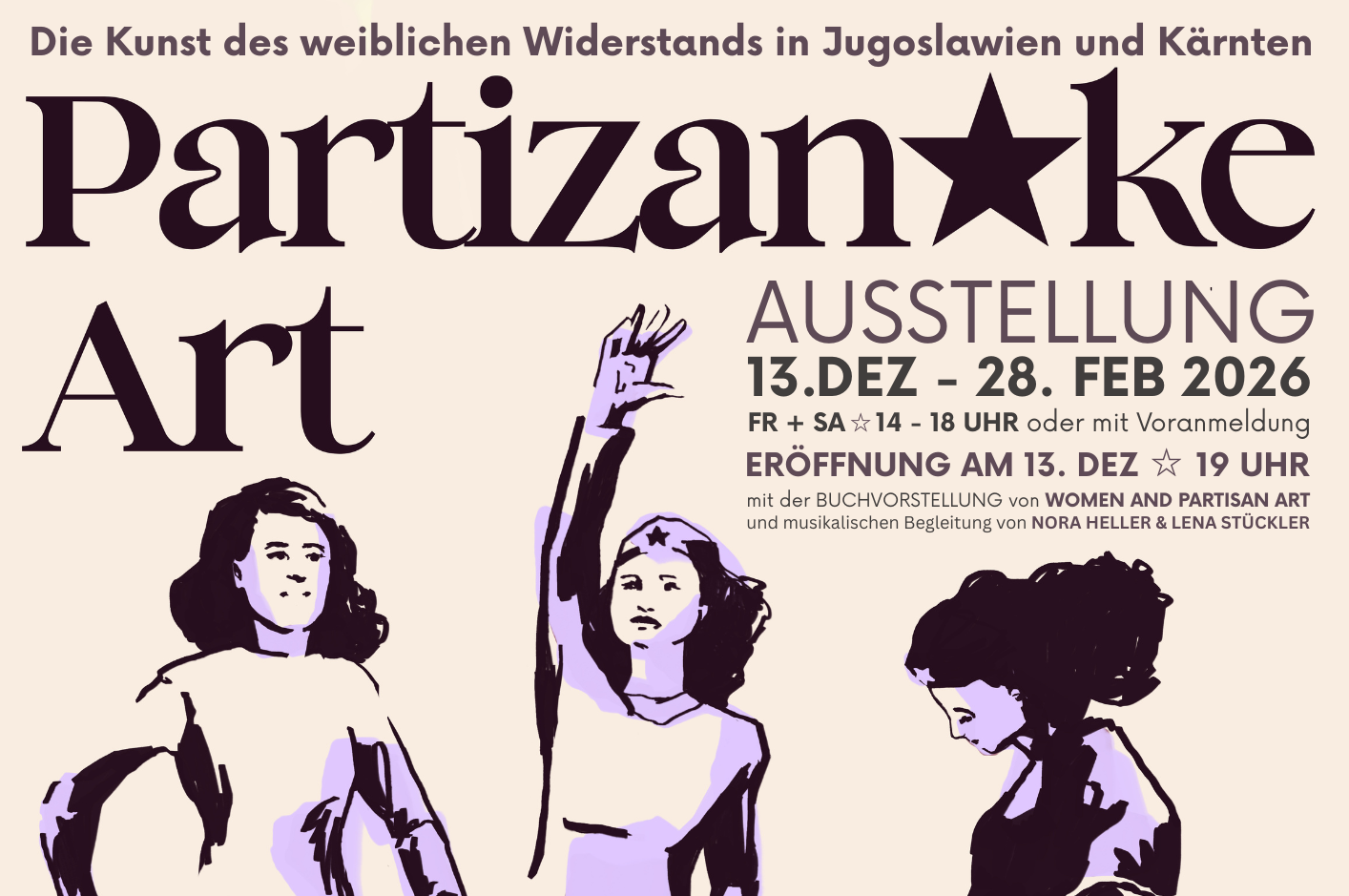 Eröffnet wird die Schau am Samstag, 13. Dezember, um 19 Uhr mit der Buchpräsentation „Women and Partisan Art – Ästhetik und Praktiken des Widerstands in Jugoslawien und Kärnten“ (transcript Verlag, 2025). Musikalisch begleitet wird der Abend von Nora Heller und Lena Stückler.