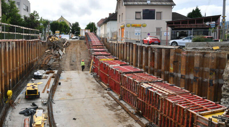 Seit Februar wird intensiv an der neuen Unterführung gearbeitet. In den vergangenen Monaten wurde die Baugrube ausgehoben und die Widerlager für die Hilfsbrücken mittels Düsenstrahlverfahren hergestellt. Beide Brücken wurden eingebaut, sodass die Gleise der wichtigen Südbahnstrecke während der Bauarbeiten uneingeschränkt nutzbar sind. Die Stahltragwerke der Hilfsbrücken wurden im ÖBB-eigenen Werk gefertigt und geprüft und werden nach Abschluss der Bauarbeiten wieder abgetragen und bei Folgebaustellen weiterverwendet.