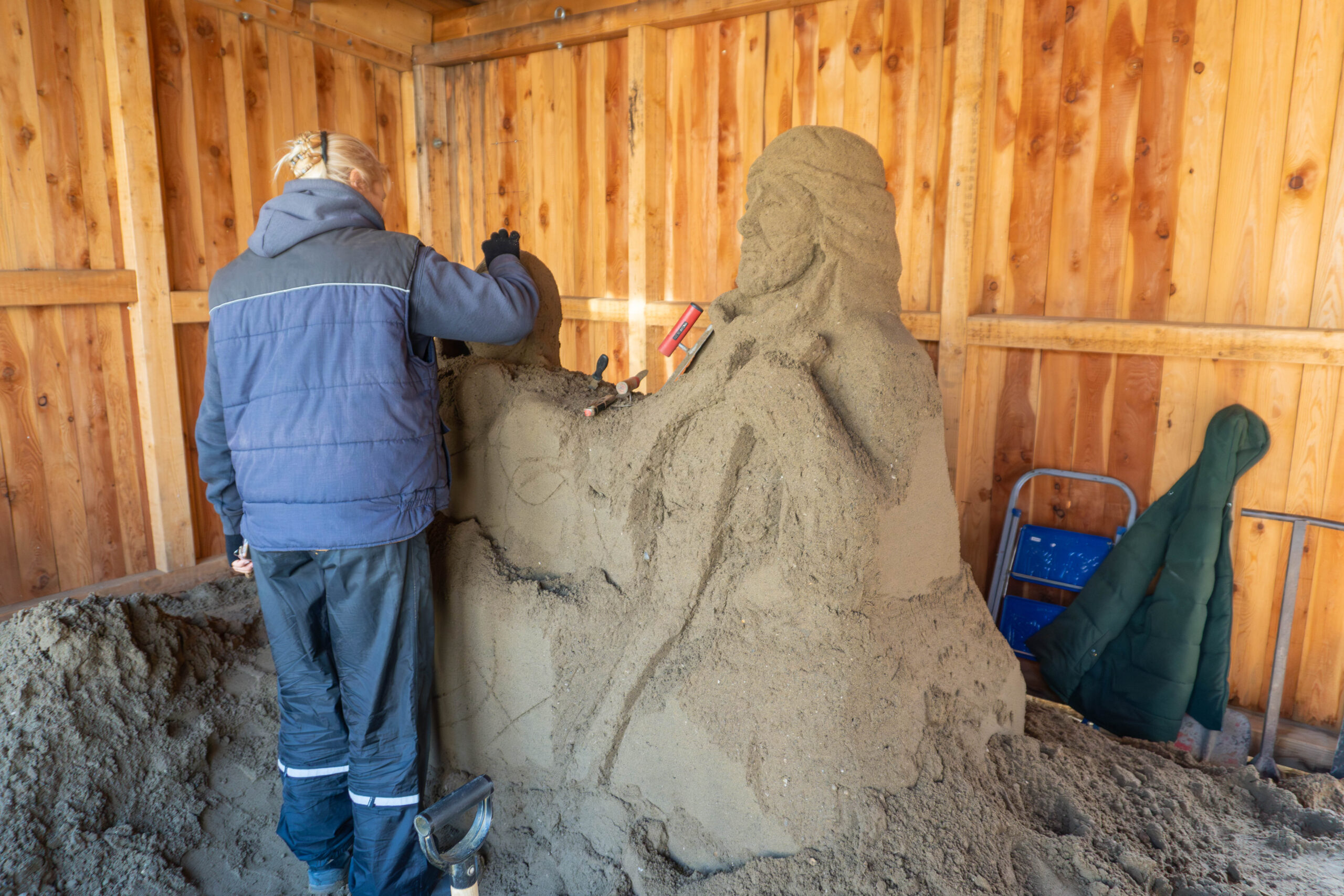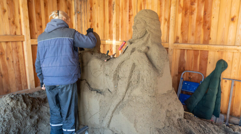 Da „Städtepartnerschaft“ eines der Schlagwörter des heurigen Christkindlmarktes ist, wurde der Sand extra aus der Partnerstadt Lignano angeliefert und wird jetzt von Künstlern, unter der Leitung von Antonio Molin aus Lignano, zu prachtvollen Skulpturen von Jesus, Maria und Josef geformt. Der Feinschliff ist bereits voll im Gange und bis zur Eröffnung des Christkindlmarktes am Samstag, um 18 Uhr, werden die Werke fertig sein. Die Hütte befindet sich übrigens neben der Bühne vor dem Rathaus.