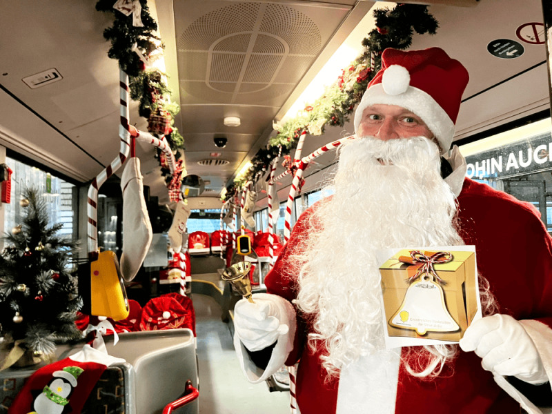 Als Buslenker sorgen der „Weihnachtsmann“ Zoran und das „Rentier“ Anja für weihnachtliche Stimmung, unterstützt von Tannengirlanden, Weihnachtsduft, geschmücktem Baum und erstmals musikalischer Untermalung. Für die kleinen Fahrgäste gibt es Sackerln mit Gummibären und Luftballons, solange der Vorrat reicht.