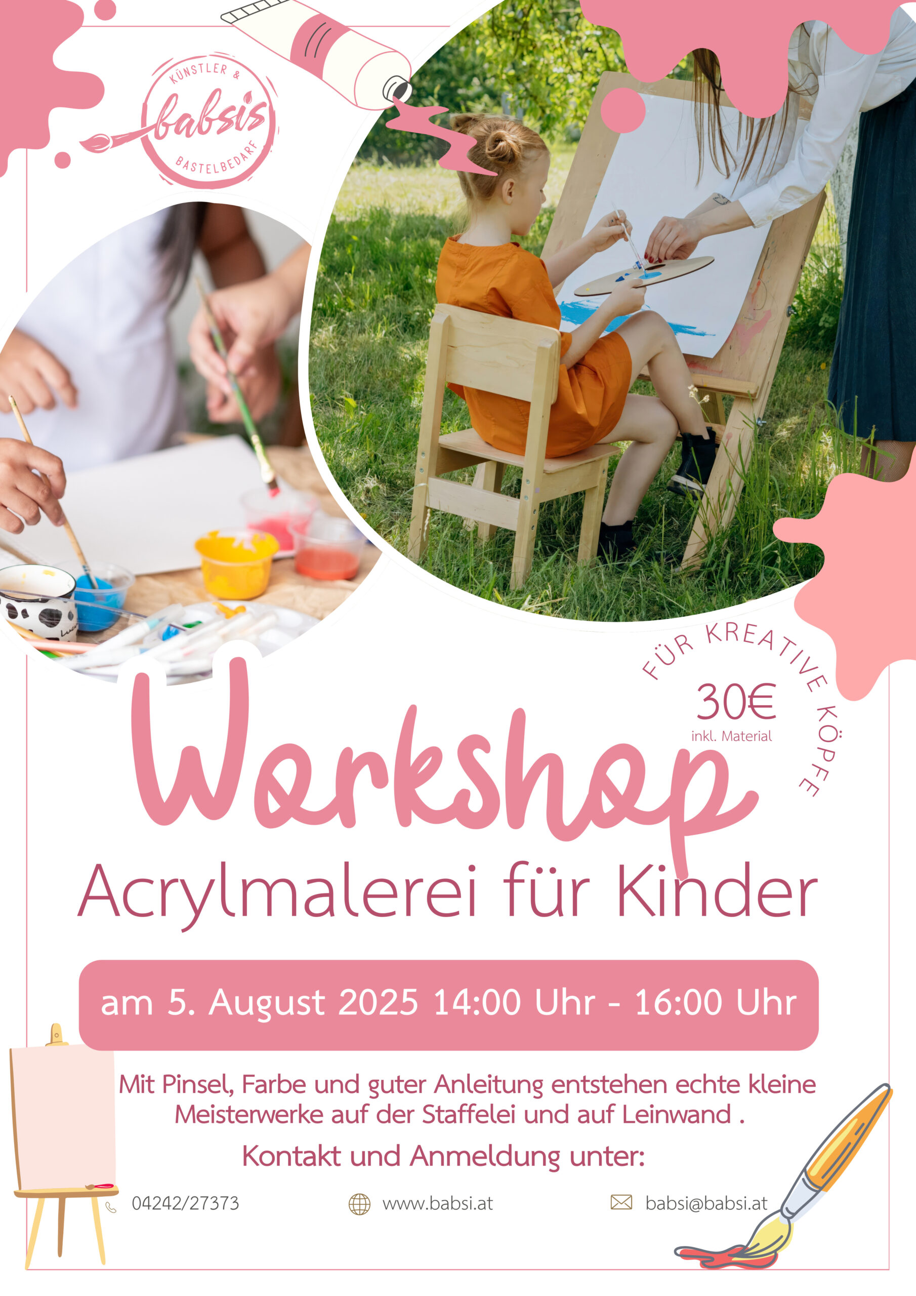 Geeignet für Kinder von 5 bis 12 Jahren – keine Vorkenntnisse notwendig, nur Lust auf Farbe, Pinsel und gute Laune!