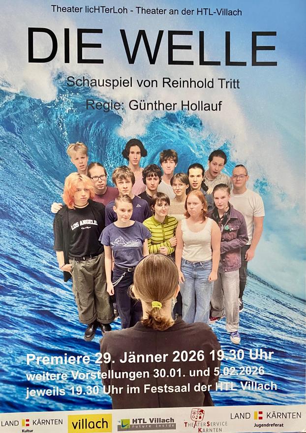 Das Theater licHTerLoh bringt den bekannten Stoff „Die Welle“ als eindringliche Bühnenfassung auf die Bühne des Festsaals der HTL Villach. Das Theaterstück basiert auf dem gleichnamigen Filmklassiker und thematisiert auf packende Weise die Dynamik von Macht, Gruppenzwang und Manipulation.